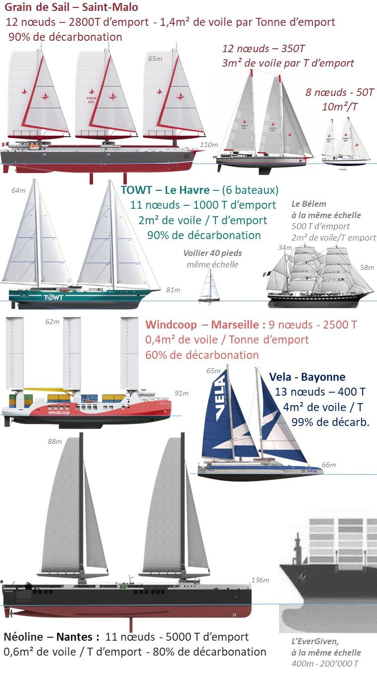 some other names, though I don’t know as much about >them: Hisseo, Fairtransport, Bourlingue et Pacotille, Heol SailingIf you want to see their respective sizes, here’s a diagram showing the ships side by side with a famous sail ship (the Bélem) and the famous cargo that blocked the Suez Canal, the Evergiven
