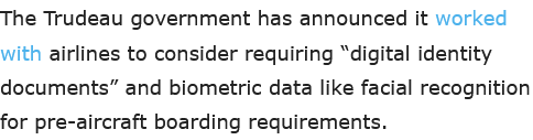In altri paesi, come il Canada (da sempre molto vicino al WEF) sono già più avanti e ci sono proposte concrete per obbligare le compagnie aeree a richiedere identità digitale e dati biometrici per poter viaggiare.