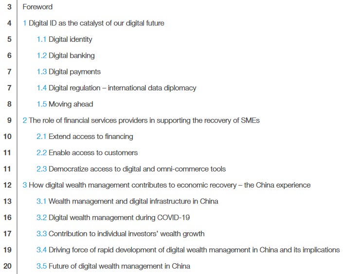 Un rapporto WEF di ottobre 2021, intitolato “Global Future Council on Responsive Financial Systems Three ways to accelerate a digital-led recovery” dimostra esattamente quanto dico. La rubrica del terzo capito, totalmente dedicato alla Cina, recita così: “The evolution of digital wealth management in China provides a model for how other economies can strengthen their inclusive finance efforts.”