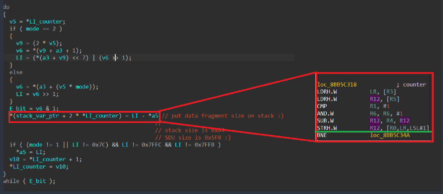 Among the approximately 75,000 different functions in the firmware, we found the function for handling an incoming SDU packet. When handling a received SDU packet, its header fields are parsed. The packet itself consists of a mandatory header, optional headers, and data. The number of optional headers is not limited. The end of the optional headers is indicated by the least significant bit (E bit) being equal to 0. The algorithm processes each header field sequentially, while their E-bits equal 1. During processing, data is written to a variable located on the stack of the calling function. The stack depth is 0xB4 bytes. The size of the packet that can be parsed (i.e., the number of headers, each header being a 2-byte entry on the stack) is limited by the SDU packet size of 0x5F0 bytes.
