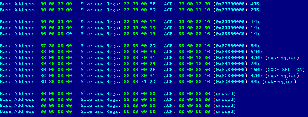 Next, by analogy, we input the address of the stack frame where our data was located, but it turned out not to be executable. We then faced the task of figuring out the MPU settings on the modem. Once again, using the ROP chain method, we generated code that read the MPU table, one DWORD at a time. After many iterations, we obtained the following table.