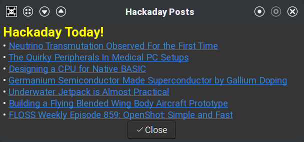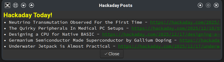 --Title "Hackaday Posts" --button="Close!gtk-ok" \